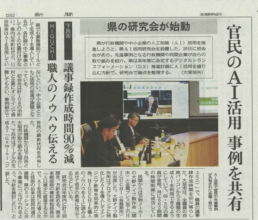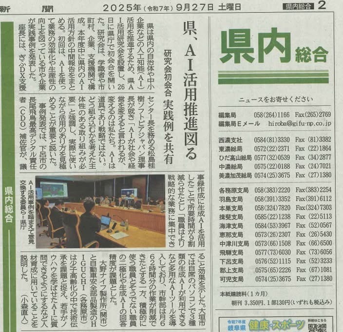 2025年9月26日(金)、岐阜県庁で開催された「県AI活用研究会」にて、弊社 常務取締役・大野が登壇し、AIを活用した弊社の取り組みについて発表させていただきました。
